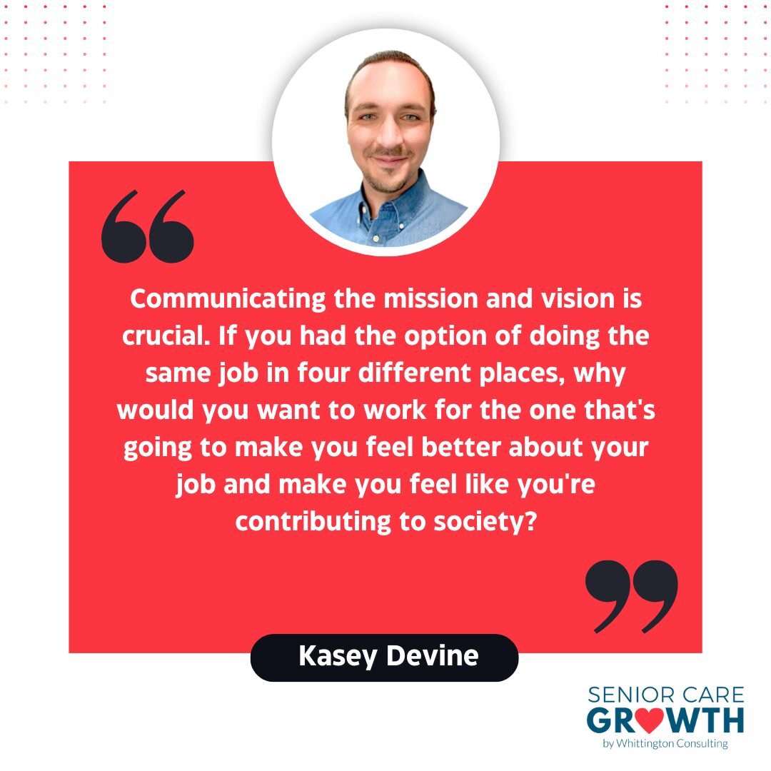 Your leadership at the community level plays a pivotal role in your ability to attract and retain talent. As Kasey Devine pointed out in our interview, “Community-level leadership dictates the state of hiring in senior living and senior care. When you have great community-level leadership, it’s pretty good. You see operators that don’t have openings, and when they do, they have a pool of referrals from existing employees because the culture is amazing.”